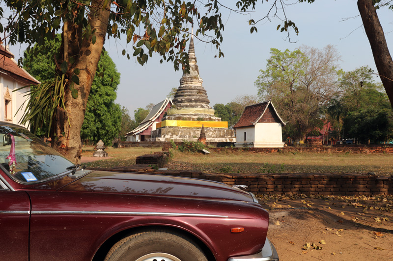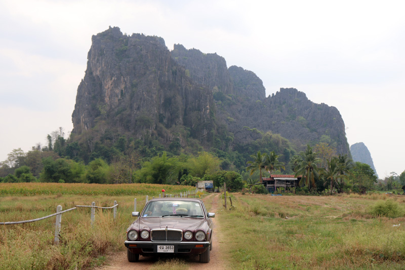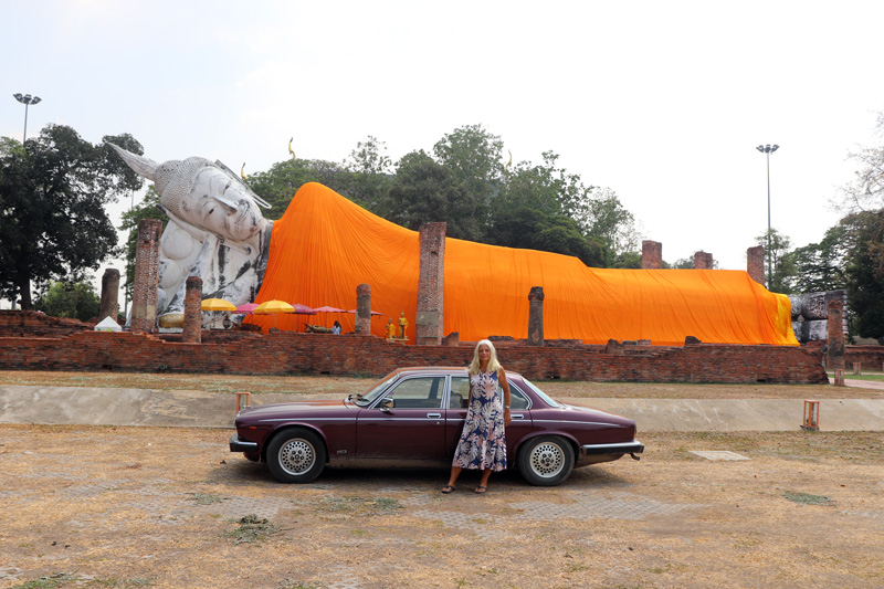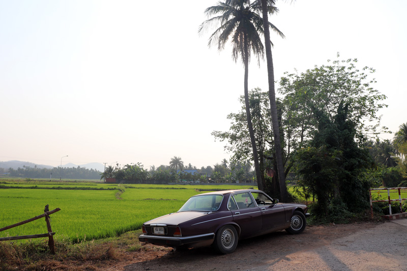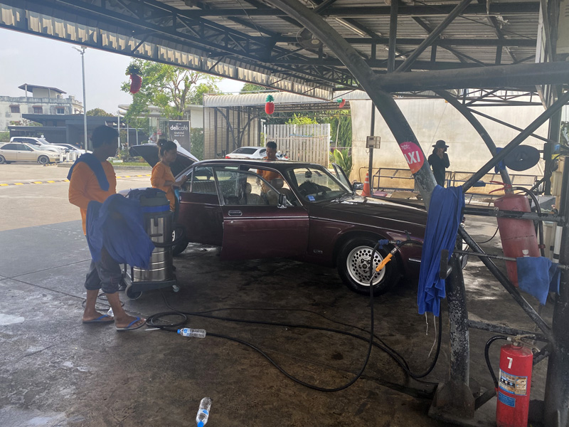 Na een paar duizend kilometer door het mooi Isaan laat de XJ6 zich de luxe van een hogedrukspuit, een lekker sopje en een heel team van poetsers graag aanleunen.