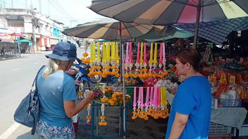Onontbeerlijk in Thailand wanneer met de auto gereisd wordt, is een guirlande van heerlijk geurende jasmijnbloempjes en een dikke roos of afrikaantjes aan het uiteinde voor aan de binnenspiegel.