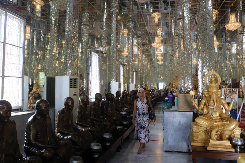 Minke loopt langs een lange rij van in brons uitgevoerde monniken achter een bedelnap. Door in iedere nap een muntje van een paar cent te gooien krijgt je karma een enorme zet de goede kant op.