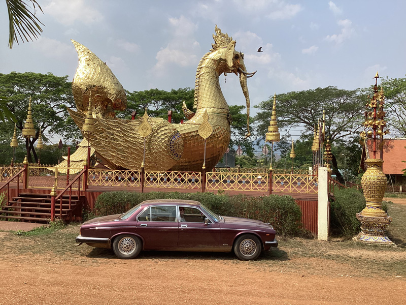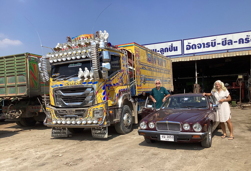 Na een paar duizend kilometer door het mooie Isaan laat de XJ6 zich de luxe van een hogedrukspuit, een lekker sopje en een heel team van poetsers graag aanleunen.